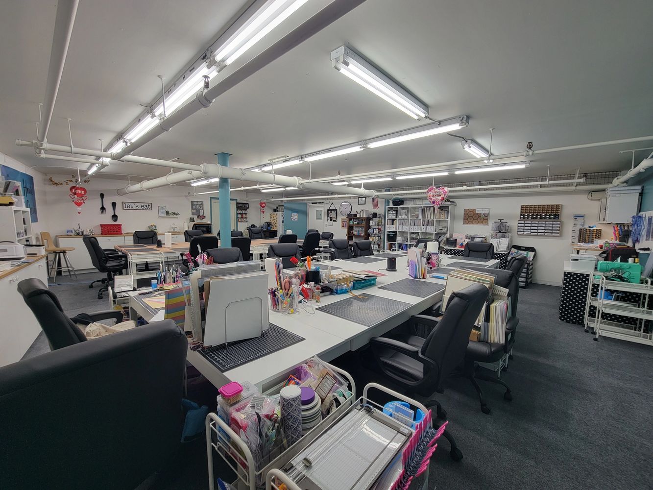 The studio can hold up to 24 crafters. Each space is approximately 35" of space but sometimes if we are not full you can utilize double the space. Each space has a comfy office chair with a 3 tier rolling cart to store you craft projects while working on them. Water, coffee, hot cocoa and candy is provided. We also have a refrigerator and microwave if you want to bring your own lunch or dinner.